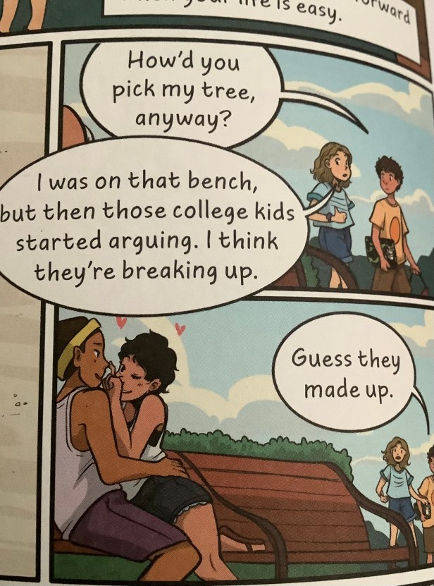 – there is a college couple that gets in a fight & then makes up; we see a bit of smooching on a park bench. (See below)