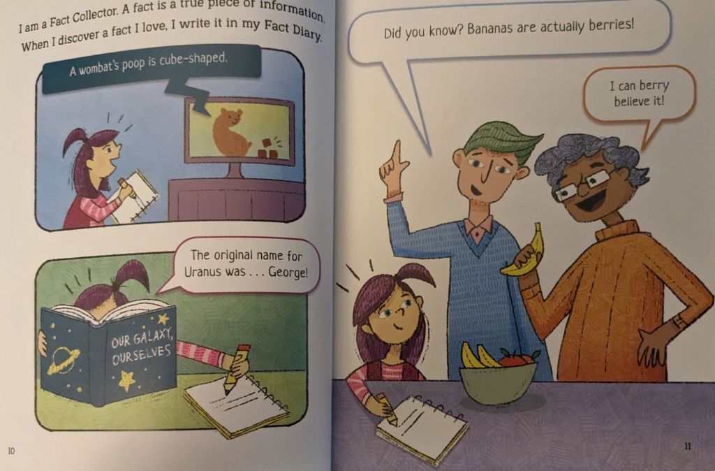 Maybe I was disappointed that the reading level was way way way lower than other young chapter books; I felt fooled into getting essentially a picture book. Sure, it has “chapters” but it calls itself a graphic novel chapter book, and that felt like a stretch. (See example below.)