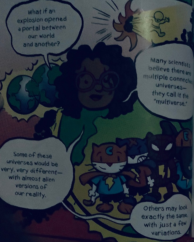 - A couple times, as if really keen on teaching the idea to kids, the author states that many scientists believe in a Multi-verse, where several universes are connected, of which have alien-type versions of reality. In this book, a portal opens to another universe, and the heroes and villains have clone type opponents step into the world from another one. If I’m letting my kid read this, I’m teaching him although it may be “many” scientists who believe this, “many” is a vague term, and I’m very much doubtful that it’s the consensus to believe in a multi-verse! (See below for example photo.)