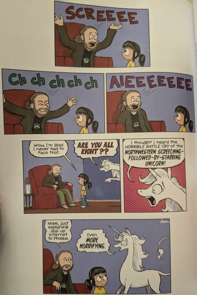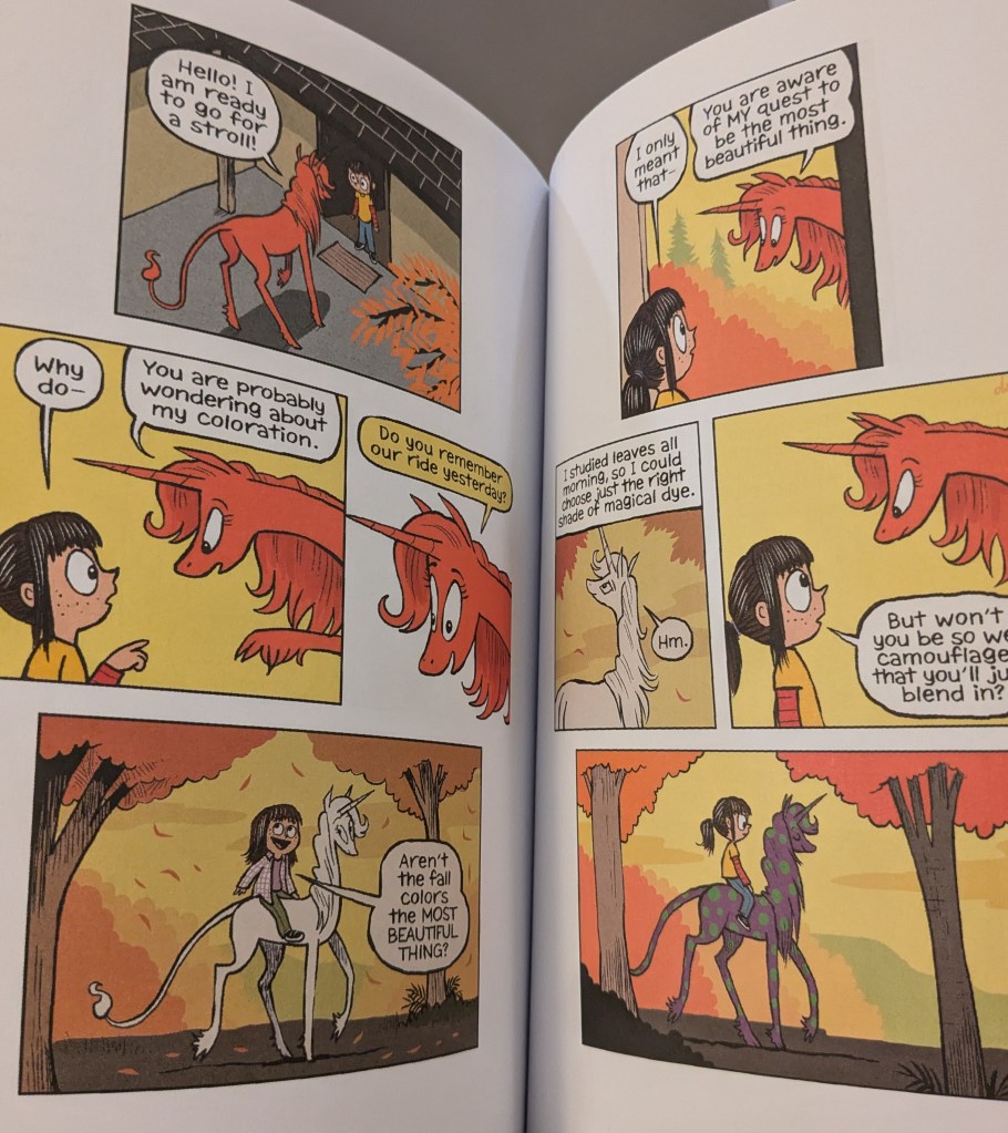 The egotistical unicorn is over-the-top, but it is admittedly clever and sometimes makes me chuckle. Here is an example, where the unicorn doesn’t want to fit in so ends up making itself wacky colors: