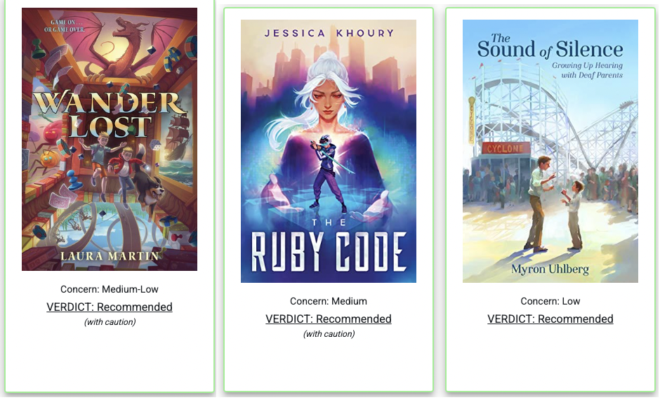 title author link verdict concern_level The Tenth Mistake of Hank Hooperman Choldenko, Gennifer https://christianparentreviews.com/book-reviews/The-Tenth-Mistake-of-Hank-Hooperman-by-Gennifer-Choldenko Recommended (with caution) Medium-Low Invisible Gonzalez, Christina Diaz and Gabriella Epstein https://christianparentreviews.com/book-reviews/Invisible-A-Graphic-Novel Recommended Low The Wingfeather Saga Peterson, Andrew https://christianparentreviews.com/book-reviews/Wingfeather-Saga-1-On-the-Edge-of-the-Sea-of-Darkness *Also reviewed on HouseFullofBookworms.com:https://www.housefullofbookworms.com/the-wingfeather-saga/ Recommended (with caution) Medium The Mystery of the Radcliffe Riddle Souders, Taryn https://christianparentreviews.com/book-reviews/The-Mystery-of-the-Radcliffe-Riddle Recommended (with caution) Medium-Low The Luminous Life of Lucy Landry Johnson, Anna Rose https://christianparentreviews.com/book-reviews/The-Luminous-Life-of-Lucy-Landry-by-Anna-Rose-Johnson Recommended (with caution) Medium-Low The Ruby Code Khoury, Jessica https://christianparentreviews.com/book-reviews/The-Ruby-Code-by-Jessica-Khoury Recommended (with caution) Medium Wander Lost Martin, Laura https://christianparentreviews.com/book-reviews/Wander-Lost-by-Laura-Martin Recommended (with caution) *Note this book is also reviewed by RedeemedReader.com: https://redeemedreader.com/2024/07/wander-lost-by-laura-martin/ Medium-Low The Sound of Silence: Growing up Hearing with Deaf Parents Uhlberg, Myron https://christianparentreviews.com/book-reviews/The-Sound-of-Silence-Growing-Up-Hearing-with-Deaf-Parents-by-Myron-Uhlberg Recommended Low Glitch Martin, Laura https://christianparentreviews.com/book-reviews/Glitch Recommended (with caution) Medium A Christmas Carol Dickens, Charles https://christianparentreviews.com/book-reviews/A-Christmas-Carol Recommended (with caution) Medium Fake Fountain, Ele https://christianparentreviews.com/book-reviews/Fake-by-Ele-Fountain Recommended Low