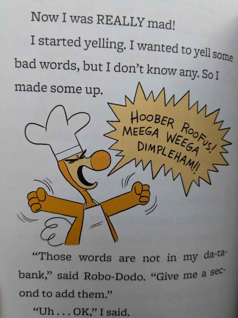 - Fake bad words. The main character gets angry and says she wanted to say bad words but didn’t know any, so she makes some up. Saying silly words seems to me like a great choice when angry. (See image below).