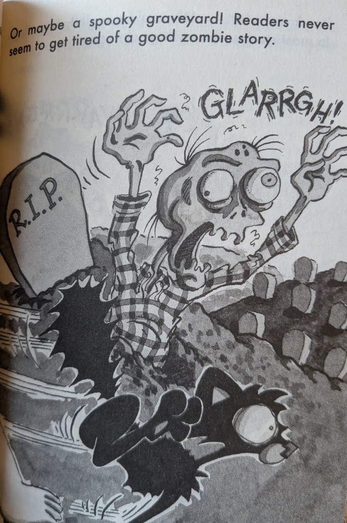 - Zombies. A zombie shows up a few times. See example image below.