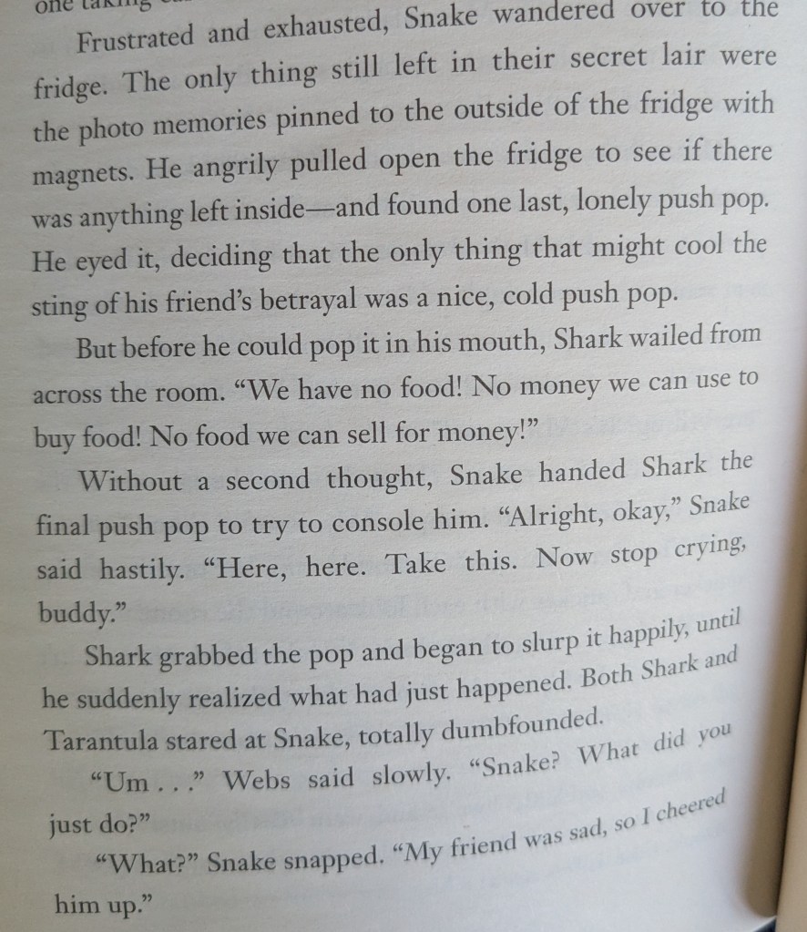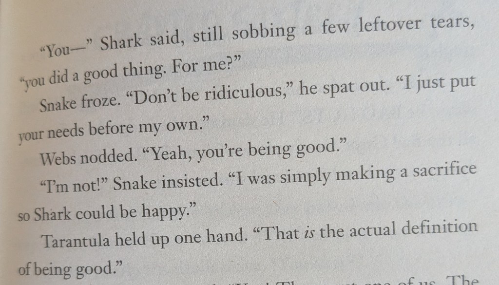 - Definition of Good. When snake gives the popsicle to shark, he argues that he wasn’t being good. (See excerpt below.). Tarantula says his explanation is the actual definition of being good. Do you agree? Why or why not? (Possible answer: We are only good through God alone, because our righteousness is like filthy rags. So this is not a definition of being good. However, what Snake described is a definition of *Love.* Putting others above ourselves is what we do when following Christ’s example, and it is a natural part of the sanctification process when we become more like Him. In short, we are only good through God, but what snake did does align with Biblical love.)