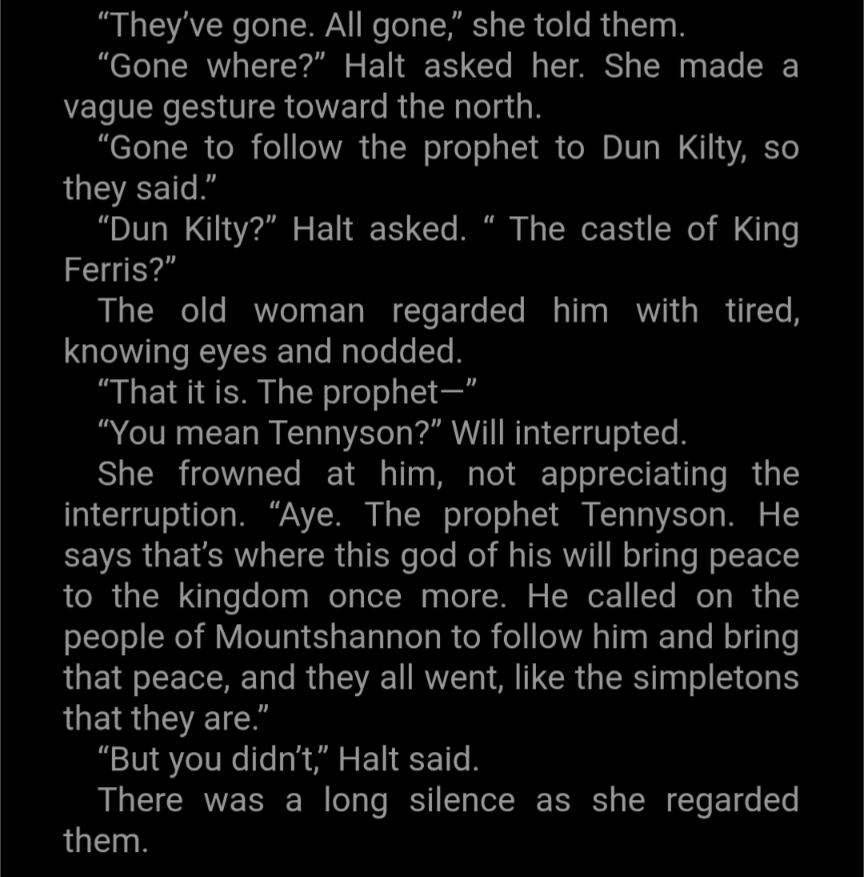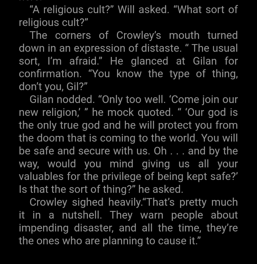 - A Religious Cult. Discussion of a false “Golden God Alseus” and his evil opponent god. The way they talk about the God being kind to everyone, even those who don’t worship him. Then they arrange attacks with bandits to scare the people into seeking the protection of their god. The people don’t know they’re behind the attacks.