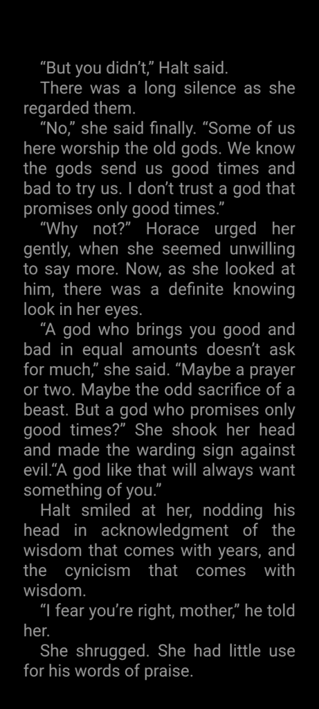 - False teaching about what God wants from us. A conversation with an old woman (around chapter 30). She says she didn’t join the cult because she doesn’t believe in a god who only promises goodness. She says, “A God who promises only goodness wants too much from you.” She says she believes in a god who gives good and bad. That kind of god, she reasons, “won’t ask too much of you—” maybe a few prayers here and there. So she basically teaches that it is better to follow a god who gives good and bad because he won’t ask much of you. So this woman, who is viewed as very wise, is uplifted for her choice to follow a god who is content to have what I would call Christmas & Easter & Sundays only religion. The woman misses the point of having a personal, intimate relationship with God, and moreover, Christians believe that God asks ALL of us! The image is below. I have suggested discussion questions below to address this.